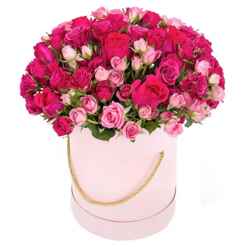 Букет состоит из 7 малиновых роз, 15 веток малиновой кустовой розы, 9 розовой кустовой розы, коробка, оазис.