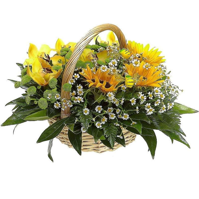 Букет состоит из 3 подсолнуха, 3 ветки хризантемы, 6 веток танацетума, 5 орхидей, зелень, корзина, оазис.