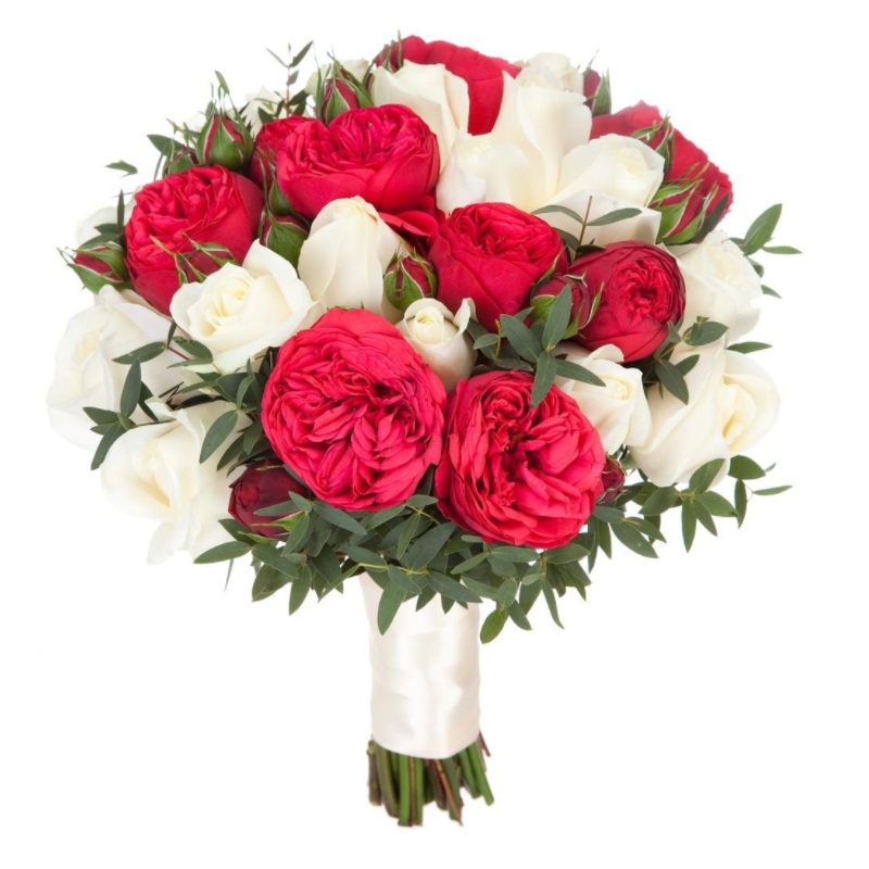 Букет состоит из 17 белых роз, 6 веток пионовидных роз, фисташка, прозрачная упаковка, атласная лента.
