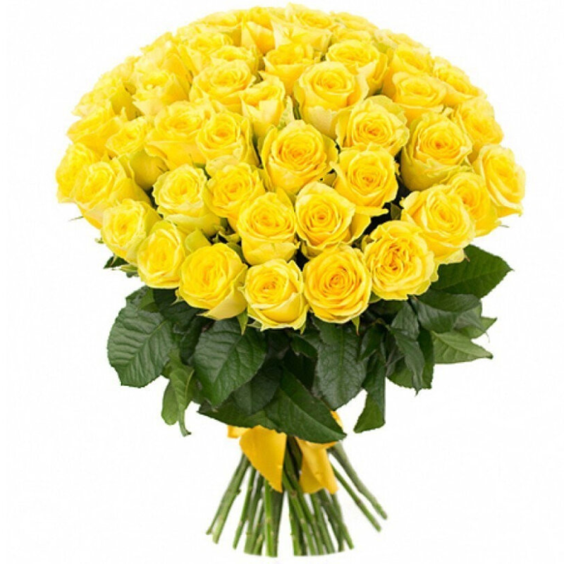 Букет состоит из 45 желтых роз, прозрачная упаковка, атласная лента.